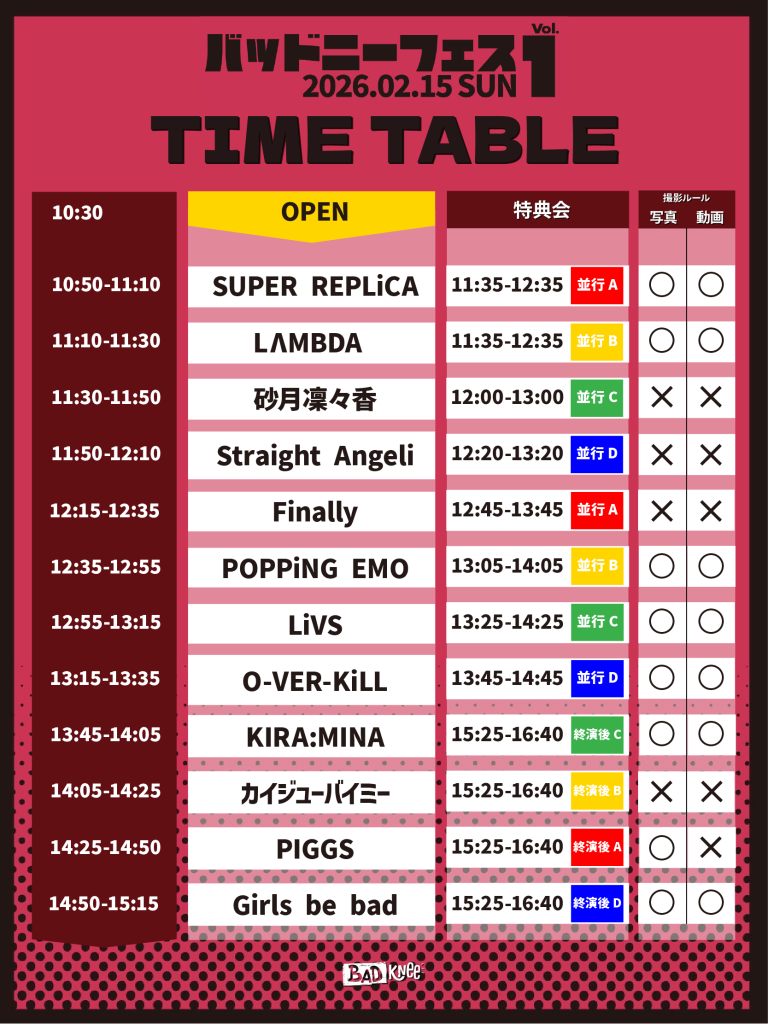 Girls be bad / POPPiNG EMO / PIGGS / カイジューバイミー / O-VER-KiLL / KIRA:MINA / 砂月凜々香 / Straight Angeli / LiVS / Finally / SUPER REPLiCA / LΛMBDA